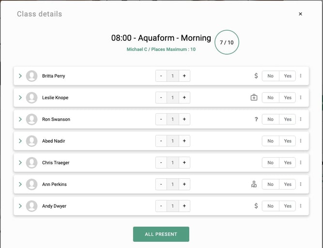 From the calendar, you can click on a class or event to see the list of registered participants. From this list, you can take attendance and see important information about members.