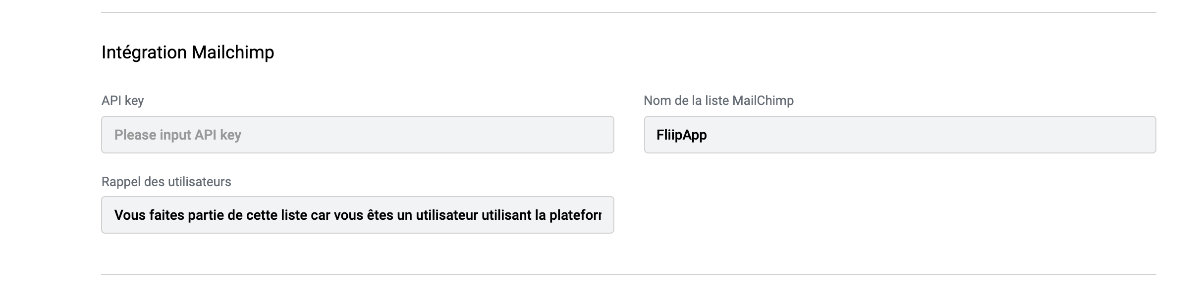 Il est possible de connecter votre plateforme FLiiP à Mailchimp, qui est un logiciel d'envoi de courriel de masse, c'est gratuit pour 2000 utilisateurs. L'avantage d'intégré ce logiciel à votre plateforme est que la liste va automatiquement s'ajuster selon l'activité de votre centre. Il est important de bien suivre les étapes dans l'ordre :