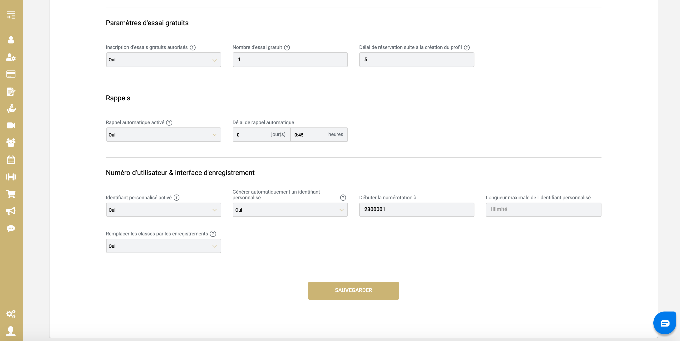 Ensuite vous pourrez choisir si vous autorisez les essais gratuits pour votre Gym, le délai de rappel automatique d'un cours.