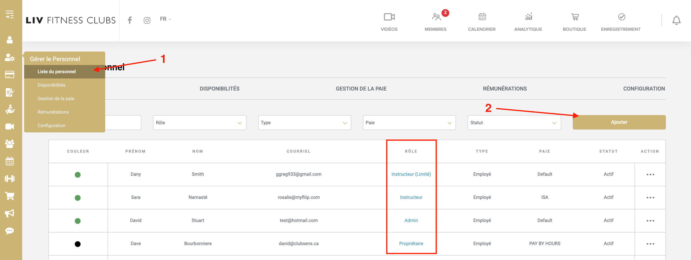 Pour créer les comptes de votre personnel, cliquez sur l'onglet "Gérer le personnel" > "Liste du personnel":