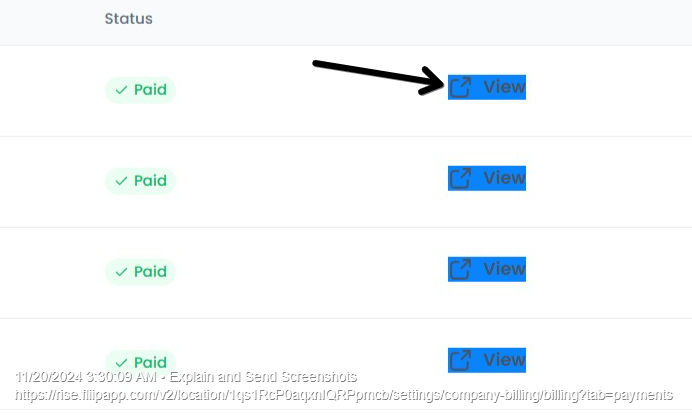 5. Vous verrez la liste de vos factures avec le statut correspondant. En cliquant sur View, vous pourrez télécharger votre facture.