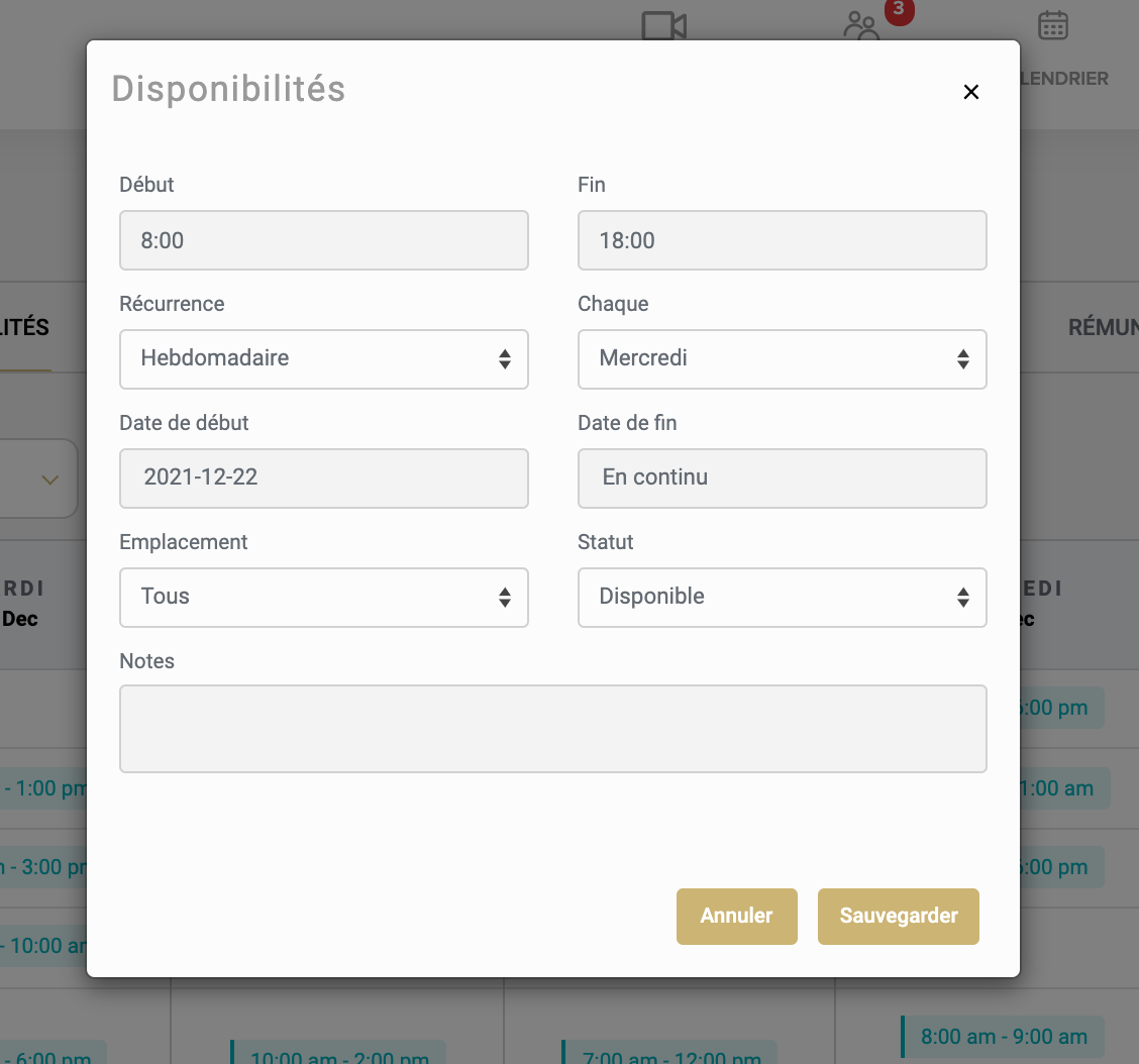 Pour faciliter la prise de rendez-vous de votre staff pour vos membres, vous pouvez rentrer manuellement leur disponibilités en suivant le chemin suivant :