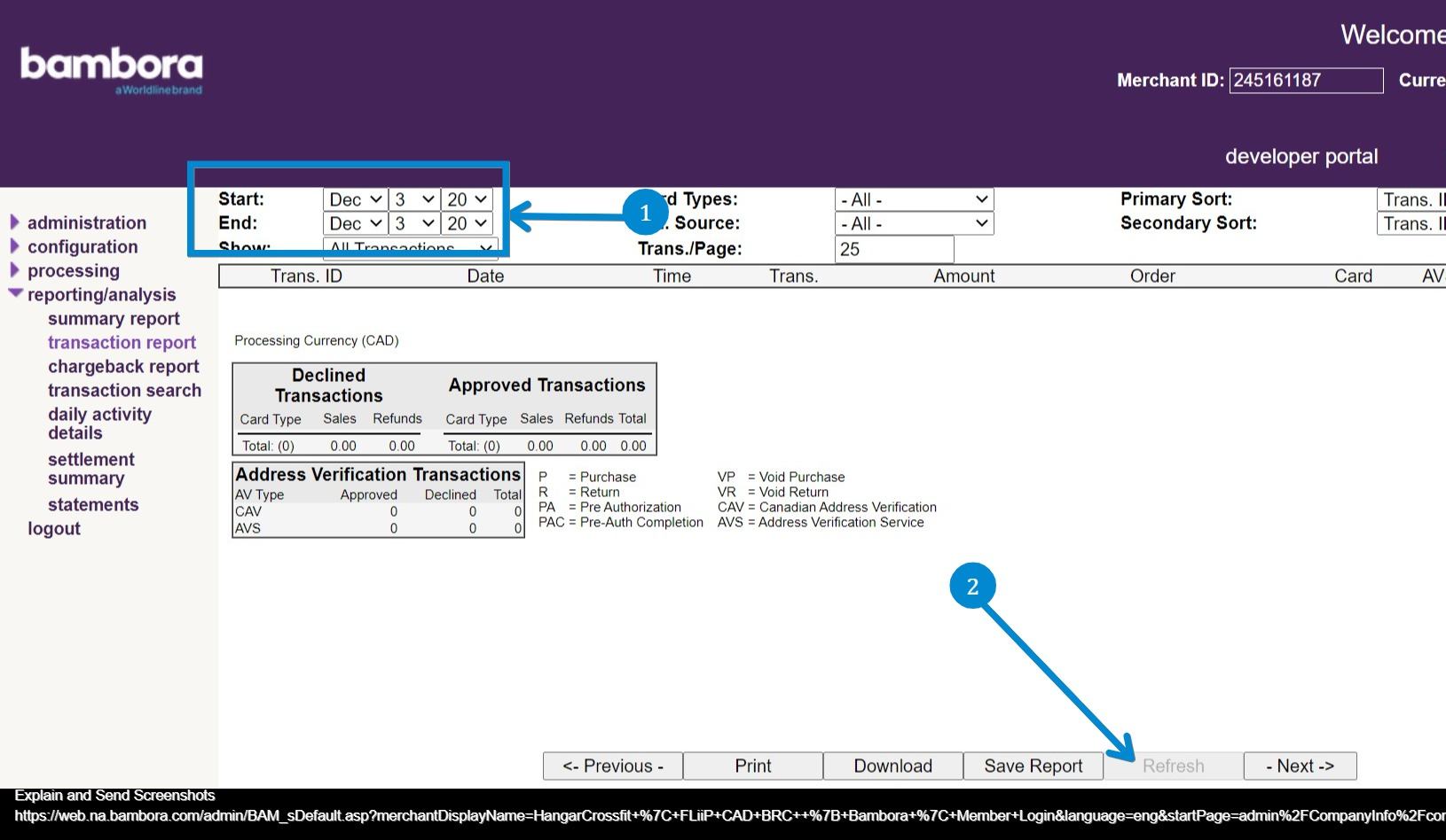 Par la suite dans les menus généraux à la gauche, cliquez sur Reporting > Transaction Report.