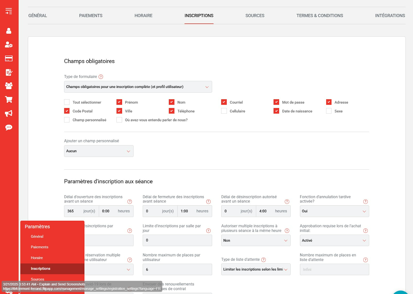 - Paramètres d'inscription