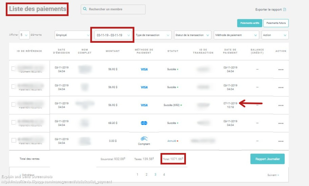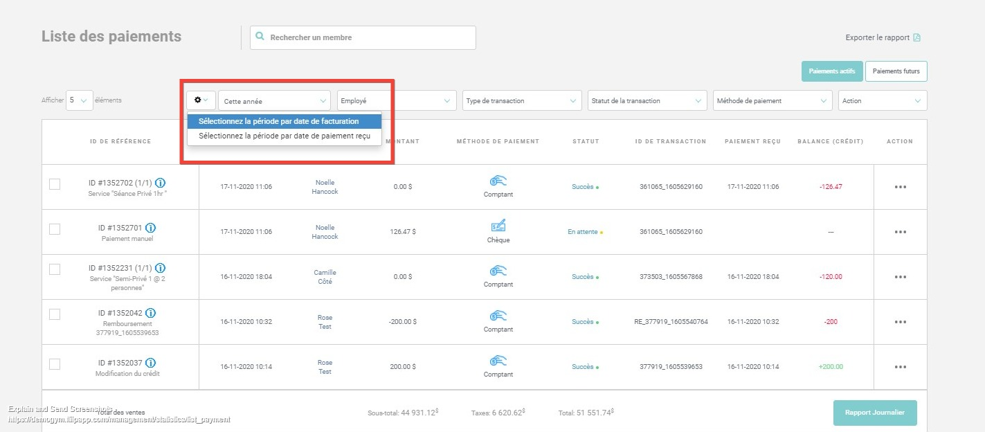 Changez le filtre de votre liste de paiements et assurez-vous d'avoir fait la bonne sélection par date de facturation ou bien par la date de paiement reçu.