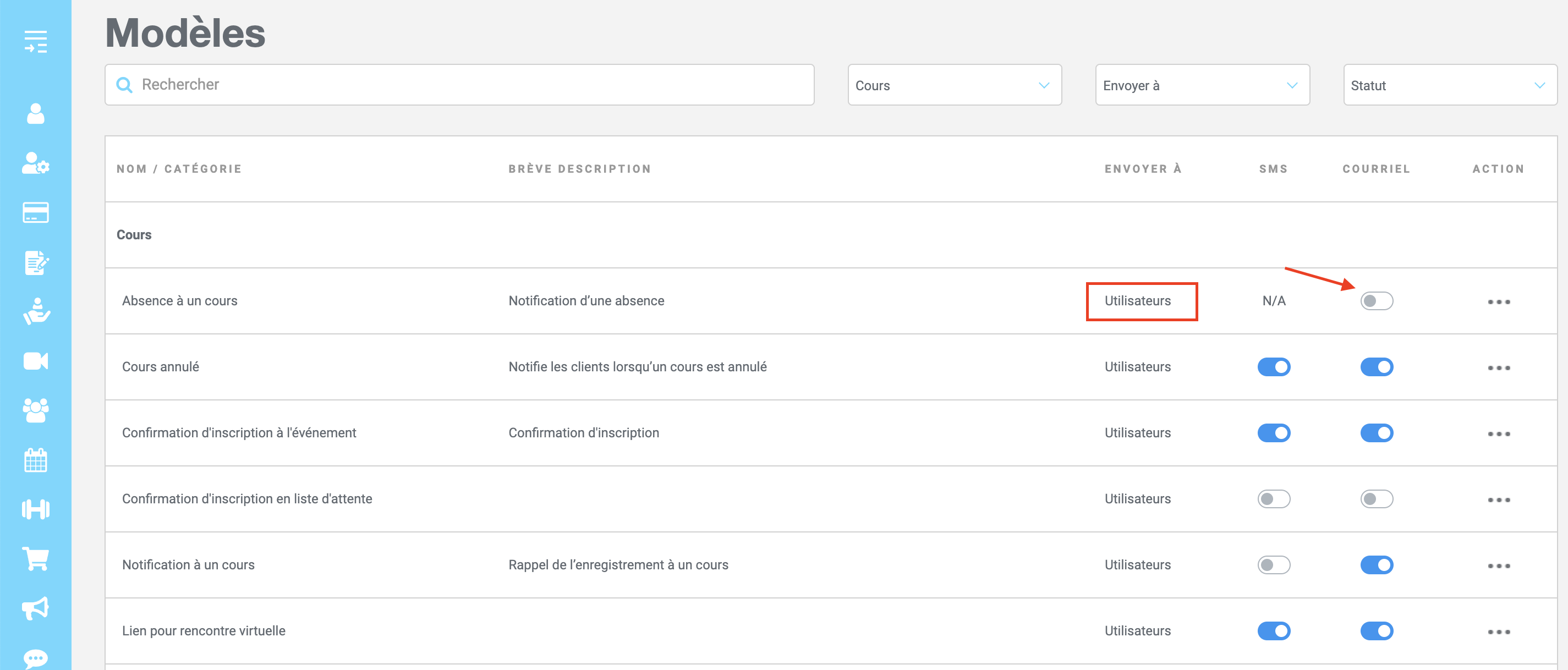 Pour activer/désactiver un modèle, utiliser le bouton prévu à cet effet. Lorsqu'un modèle peut aussi être envoyé par SMS, ce sera indiqué. C'est le client qui peut définir sa préférence de communication (SMS ou courriel) directement dans son profil (Profil> Préférences).