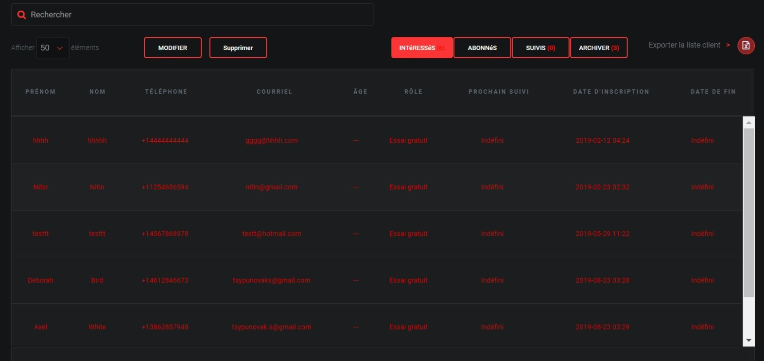 Dans l'onglet "Essai gratuit", ce client potentiel apparaîtra sous la rubrique "Intéressé". Par la suite, quand ce client aura fait son cours, il sera automatiquement redirigé vers la rubrique "Suivi".