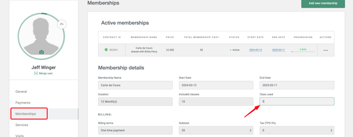 - In the clients profile (Membership management), access the "membership" tab then you will be able to modify the number of classes only if the membership limit is defined by a quantity.