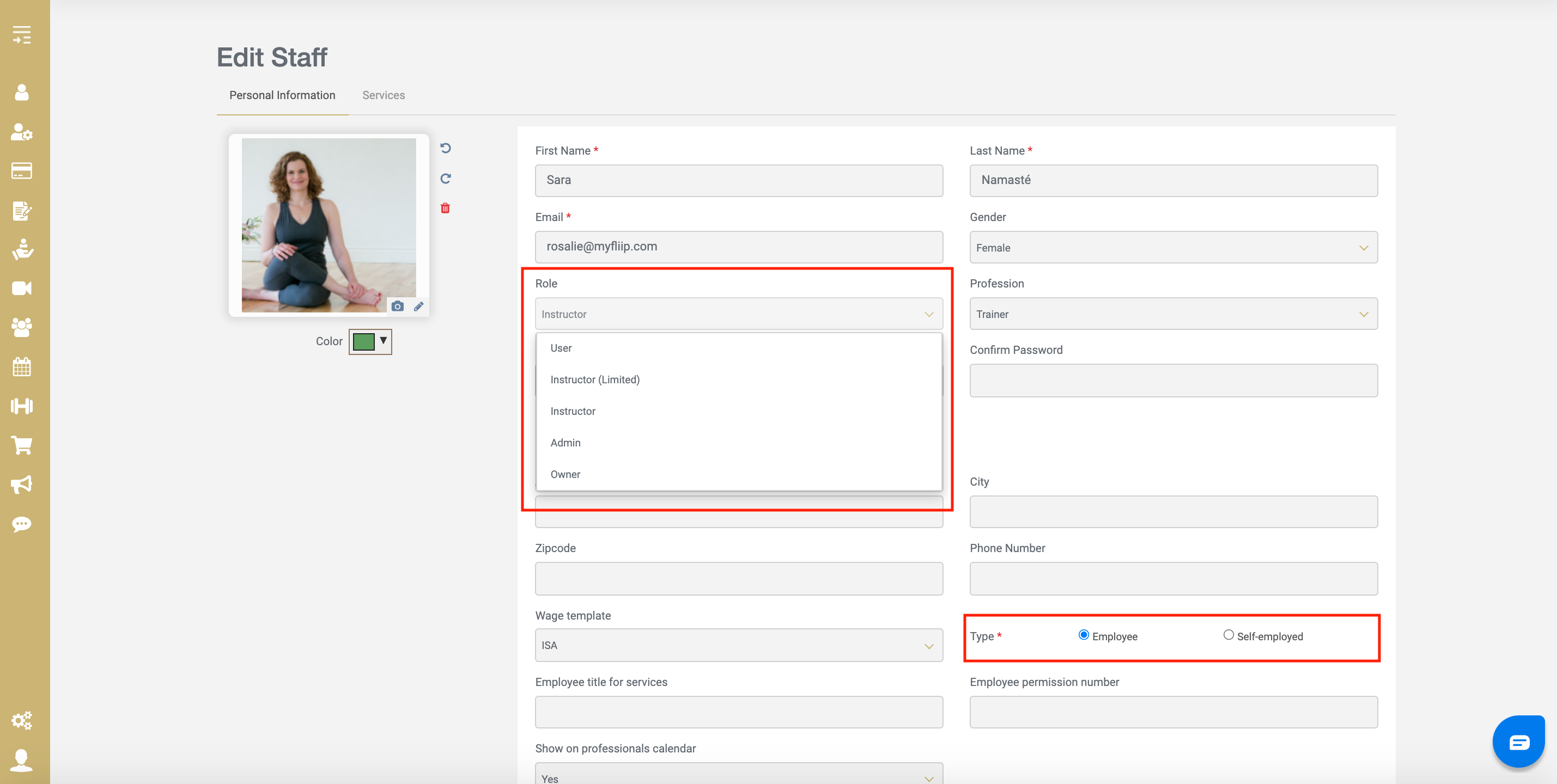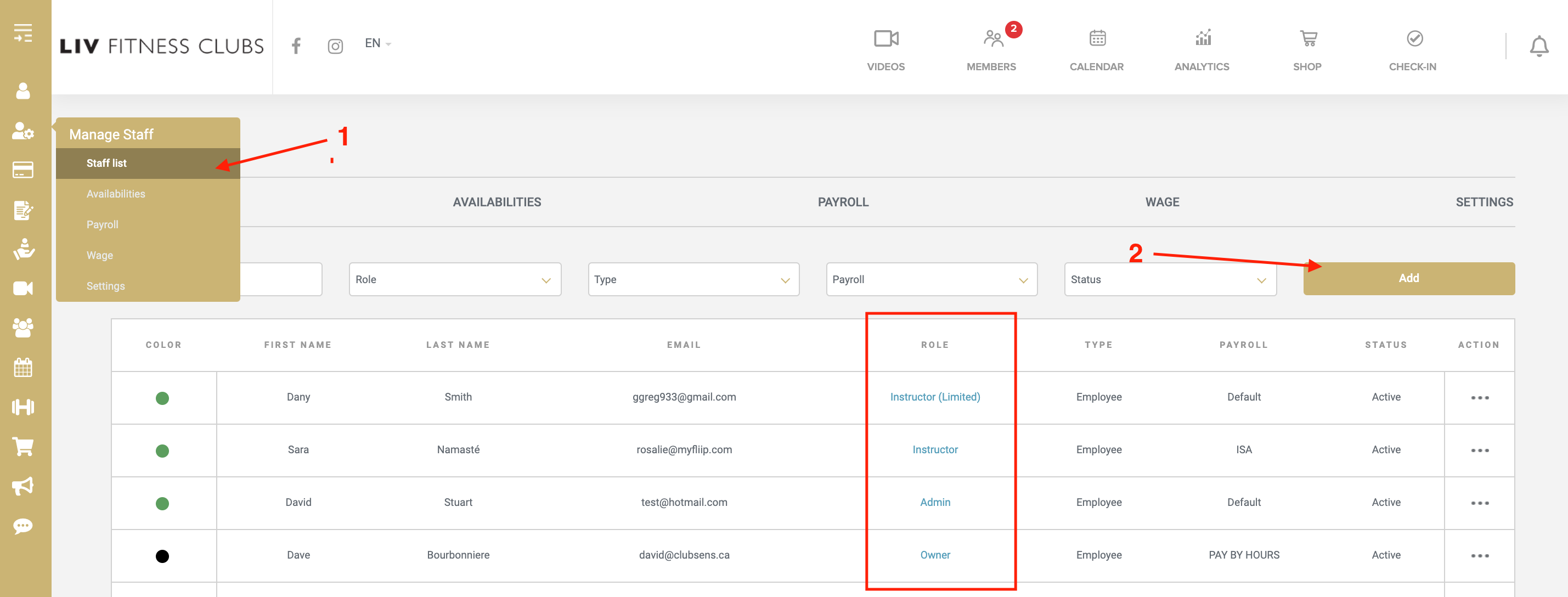- Instructor (Limited) - This role will allow the employee to take class attendance, add a member to a class, and remove a member from a class. However, he will not have access to the "Membership management" tab, which contains the profile of all your members. Note: attendance can be done via the web version or on the mobile application.